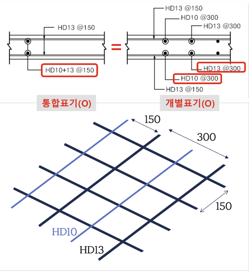 - HD10@300 + HD13@300 ์ด ํ๊ธฐ๋ฅผ ์ฒ์ ๋ณด๋ฉด "HD10 ์ฒ ๊ทผ์ 300mm ๊ฐ๊ฒฉ์ผ๋ก, HD13 ์ฒ ๊ทผ๋ 300mm ๊ฐ๊ฒฉ์ผ๋ก ๋์ผ๋ผ๋ ๊ฑด๊ฐ?" ํ๊ณ ์๊ฐํ๊ธฐ ์ฝ์ต๋๋ค.์ด ํ๊ธฐ๋ ์ฌ์ค ์์์ ์ค๋ช ํ HD10+13@150๊ณผ ์์ ํ ๋์ผํ ์๋ฏธ๋ฅผ ๊ฐ์ง๋๋ค.์ด๊ฒ์ ๋ ๊ฐ์ง ์ข ๋ฅ์ ์ฒ ๊ทผ์ ๋ฒ๊ฐ์ ๋ฐฐ์นํ๋, ๊ฐ๊ฐ์ ์ข ๋ฅ๋ง ๋๊ณ ๋ดค์ ๋๋ 300mm ๊ฐ๊ฒฉ์ผ๋ก ๋ฐฐ์น๋๋ค๋ ๊ฒ์ ๋ปํฉ๋๋ค. ์๋ฅผ ๋ค์ด, HD10๋ง ๋ณด๋ฉด 300mm๋ง๋ค ํ๋์ฉ ์๊ณ , HD13๋ง ๋ณด๋ฉด 300mm๋ง๋ค ํ๋์ฉ ์๋ ํํ์ธ ๊ฑฐ์ฃ .[HD10] -- 150mm -- [HD13] -- 150mm -- [HD10] -- 150mm -- [HD13] ...